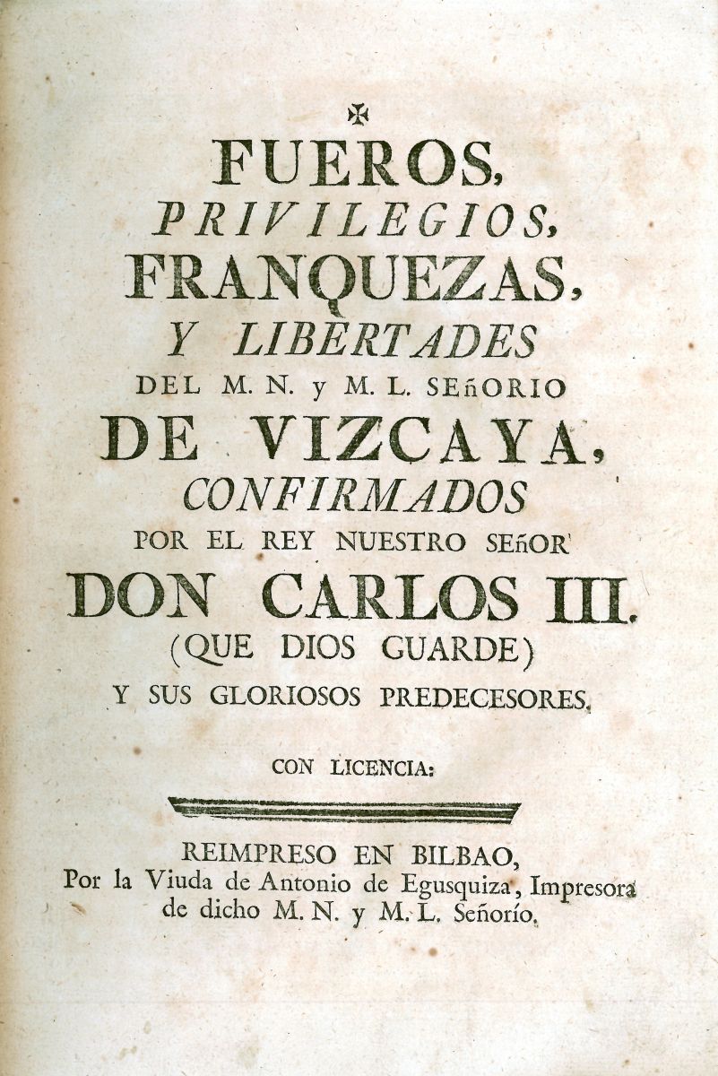 FUEROS, PRIVILEGIOS, FRANQUEZAS, Y LIBERTADES del M. N. y M. L. señorio DE VIZCAYA, confirmados por el Rey nuestro señor DON CARLOS III. (Que Dios guarde) y sus gloriosos predecesores.