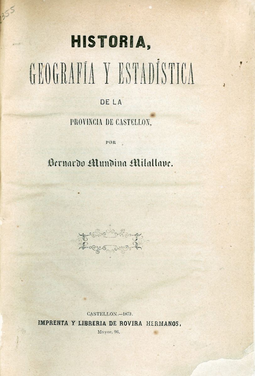 1873. Castellón. Rovira Hermanos. En 4º, holandesa puntas, ruedas doradas en planos, lomo cuajado. 694 p.-1 h. Pese a su impresión original algo deficiente se trata de un trabajo valiosísimo, por la cantidad de datos, costumbres, curiosas y peculiaridades de cada pueblo, incluso cita las formas de su habla característica cuando la tienen.
