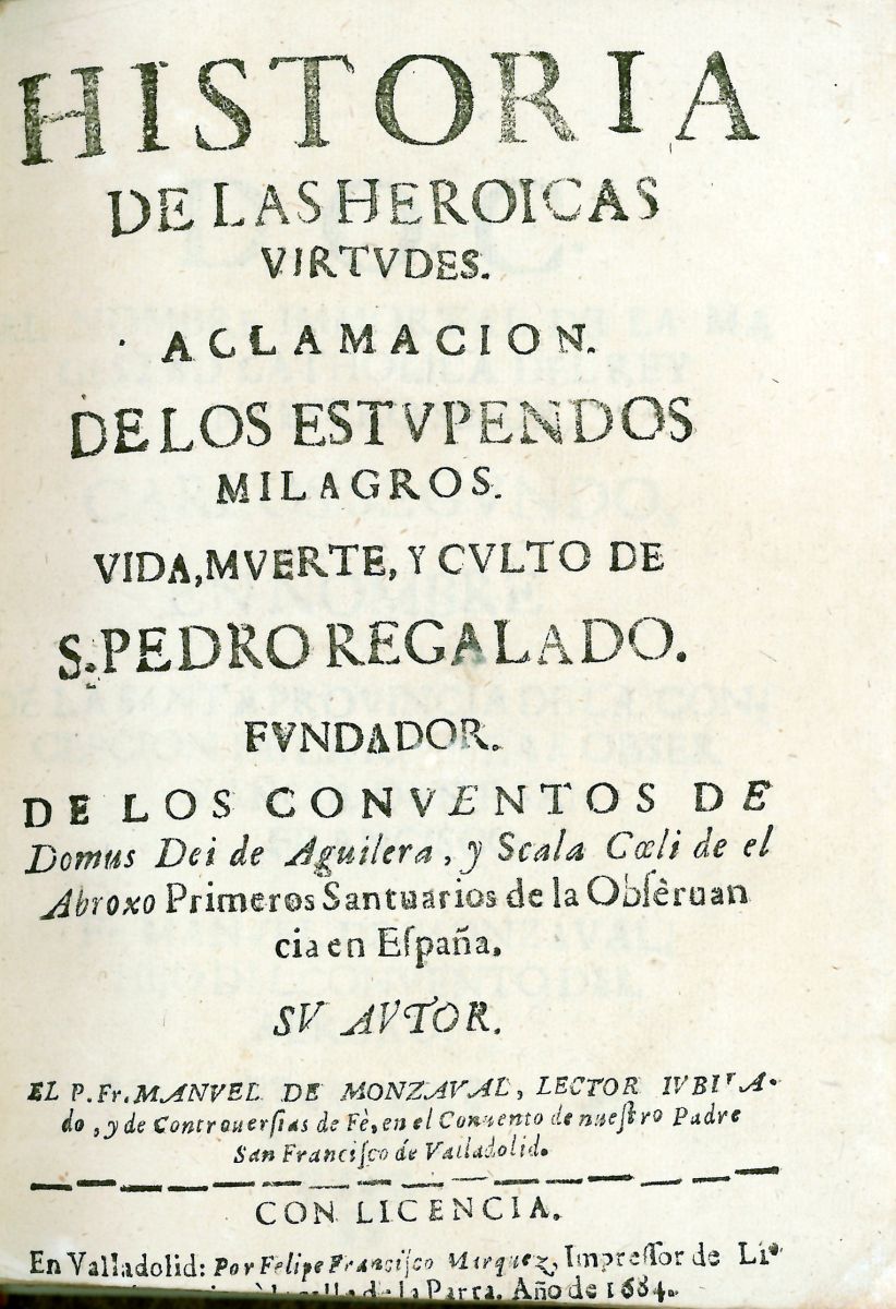 Historia de las Heróicas Virtudes, aclamación de los estupendos Milagros, Vida, Muerte y Culto de S. Pedro Regalado. Fundador de los conventos de Domus Dei de Aguilera y Scala Coeli de el Abroxo, primeros Santuarios de la Observancia en España.