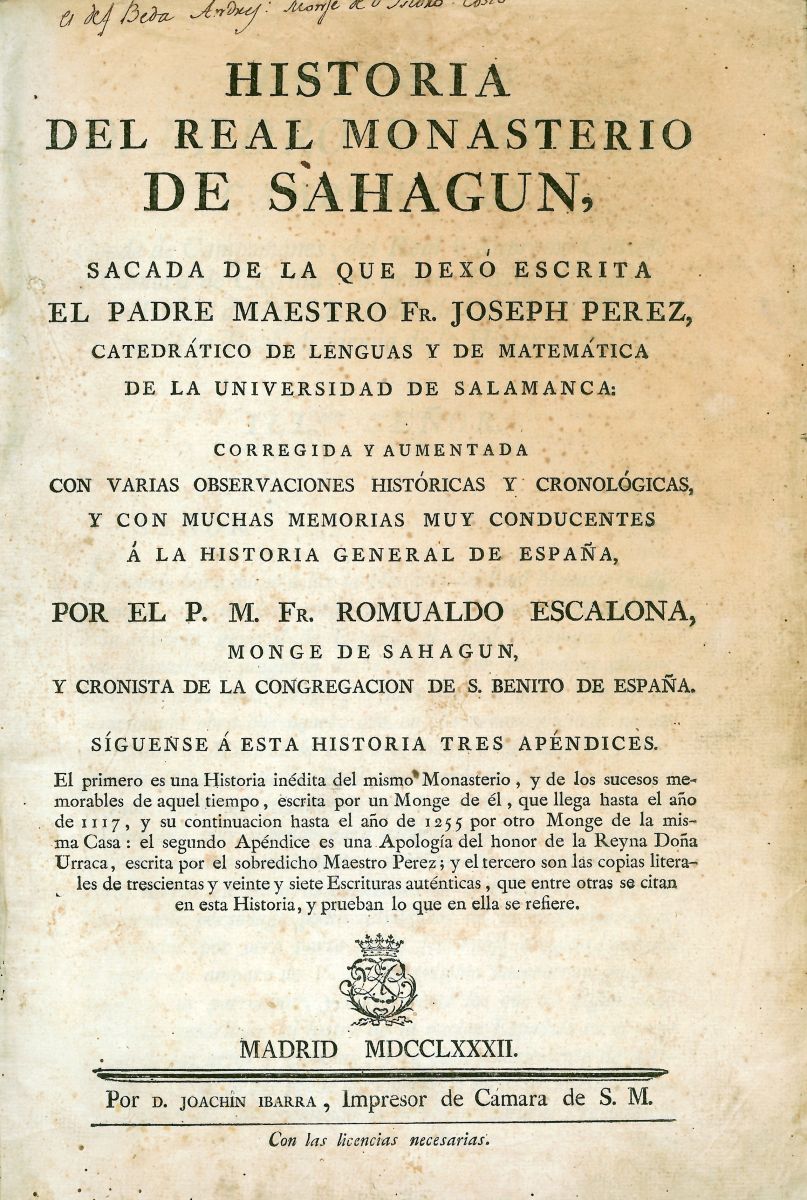 Historia del Real Monasterio de Sahagún. Sacada de la que dejó escrita el Padre Maestro Fr. Joseph Pérez, Catedrático de Lenguas y de Matemática de la Universidad de Salamanca. Corregida y aumentada con varias observaciones históricas y cronológicas y con