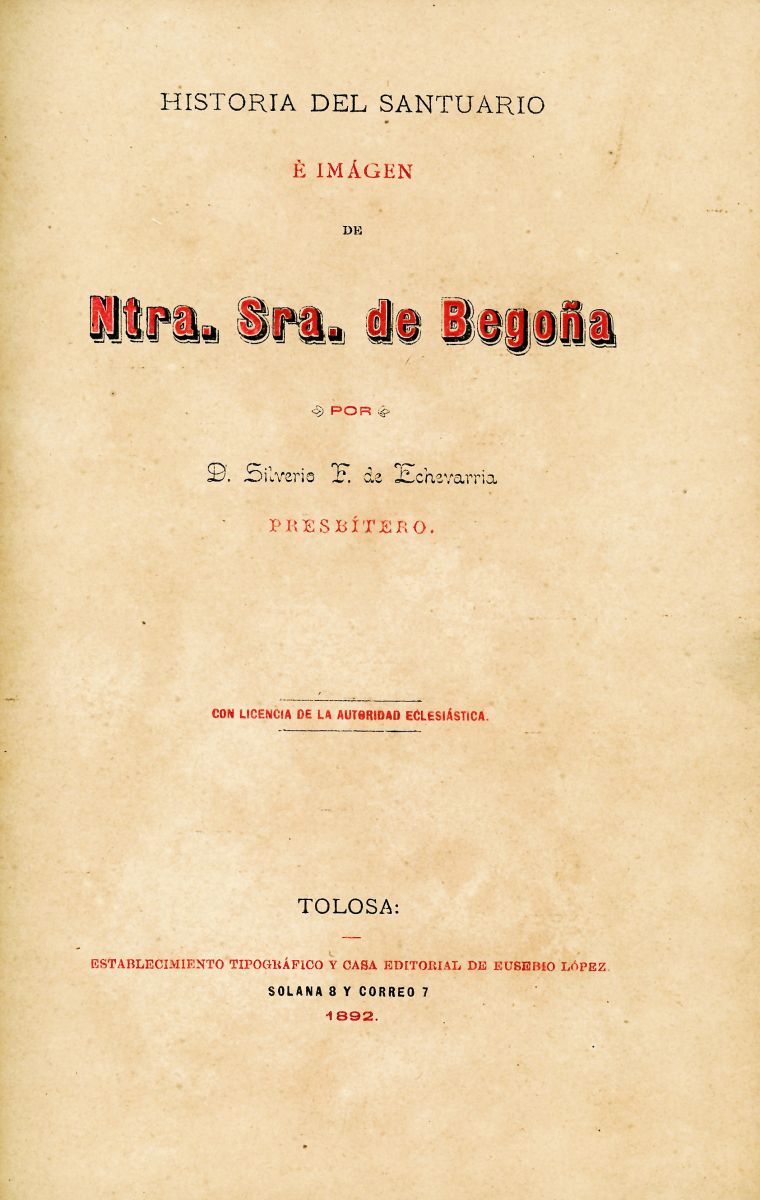 En 4º, tela editorial, cantos pintados en rojo. VI p.-329 p. 3 h. 1 lámina. Partitura del himno a la Virgen "El Peregrino", en vasco y castellano.