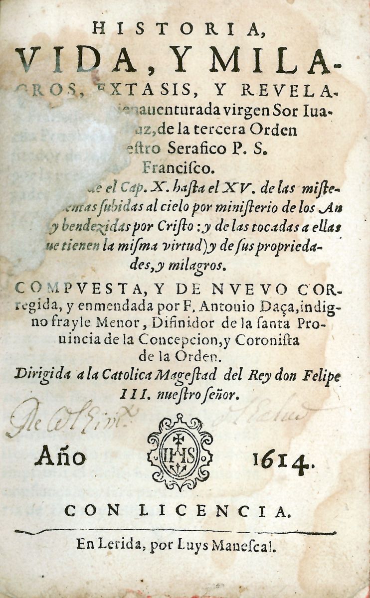 Historia, vida y milagros, éxtasis y revelaciones de la bienaventurada virgen Sor Iuana (Inés) de la Cruz de la tercera Orden… Compuesta, y de nuevo corregida, y enmedada por… Dirigida a la Catolica Magestad del Rey don Felipe III, nuestro Señor.