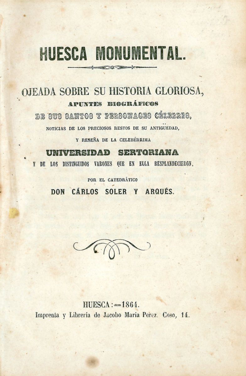 Huesca Monumental. Ojeada sobre su historia gloriosa. Apuntes biográficos de sus santos y personages célebres. Noticias de los preciosos restos de su antigüedad y reseña de la celebérrima Universidad Sertoriana y de los distinguidos varones que en ella re