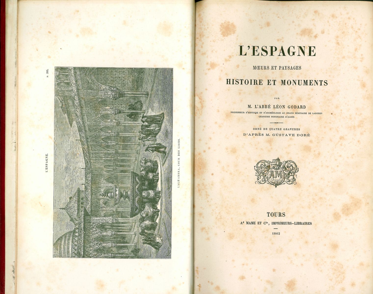 Orné de qvatre gravures d'apres M. Gustave Doré. Tours. Mame et Cia. 1862. 4º, tela editorial.4 grabados de Doré, 3 h.-348 p. Exlibris de Ramón García Diego de la Huerga. Manchas en primeras hojas.