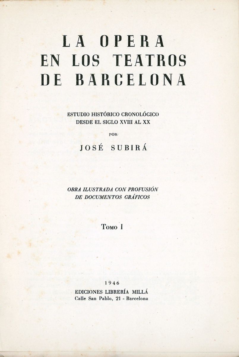 La Opera en los teatros de Barcelona. Estudio histórico cronológico desde el siglo XVIII al XX. Obra ilustrada con profusión de documentos gráficos. Dibujos de J. Mur.