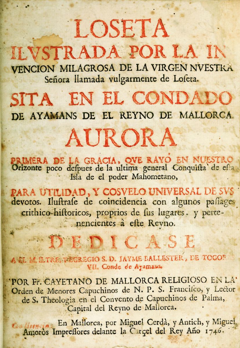 Loseta Ilustrada por la Invención Milagrosa de la Virgen Nuestra Señora llamada vulgarmente de Loseta. Sita en el condado de Ayamans de el Reyno de Mallorca. Aurora primera de la Gracia, que rayó en nuestro Orizonte poco después de la última general Conqu