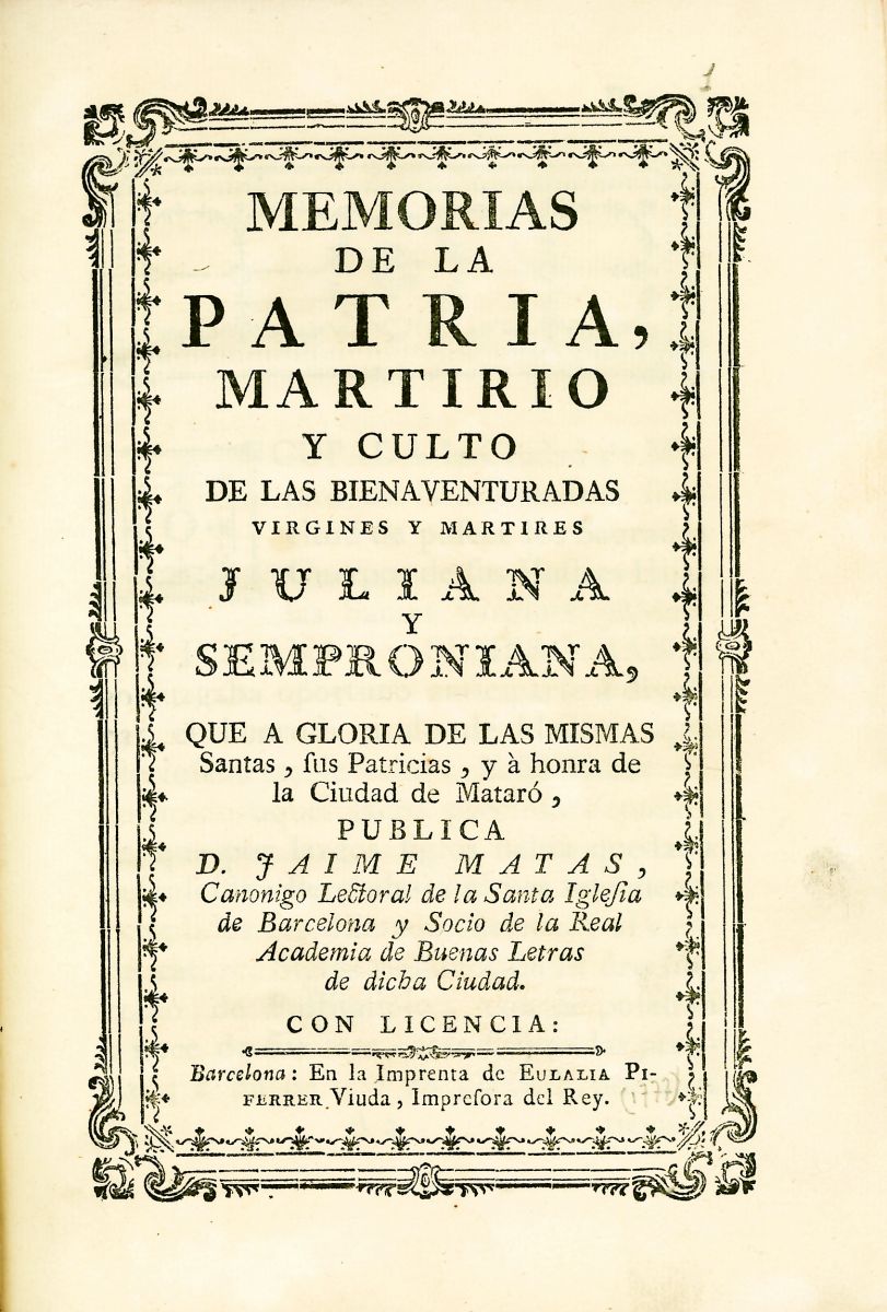 Memorias de la Patria, Martirio y Culto de las Bienaventuradas Vírgenes y Mártires Juliana y Semproniana, que a gloria de las mismas Santas, sus Patricias, y a honra de la Ciudad de Mataró publica...
