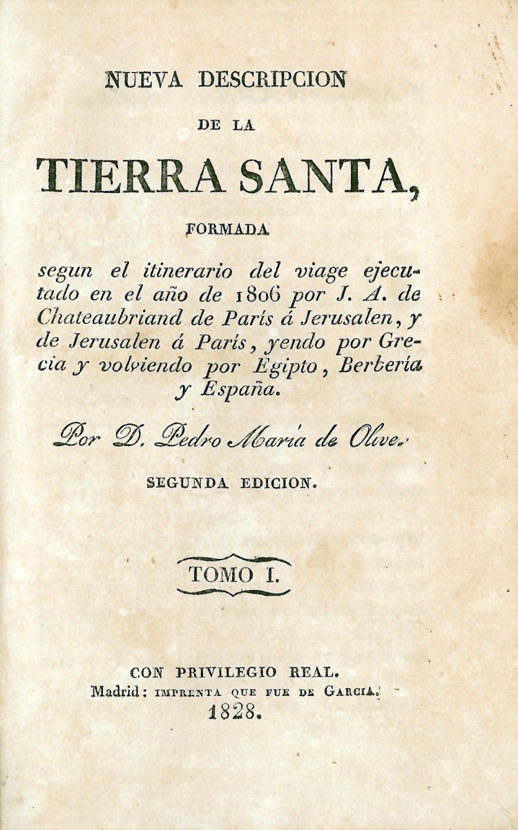 Nueva descripción de la Tierra Santa, formada según el itinerario del viage ejecutado en el año 1806 por J.A. de Chateaubriand de París a Jerusalén, y de Jerusalén a París, yendo por Grecia y volviendo por Egipto, Berbería y España.