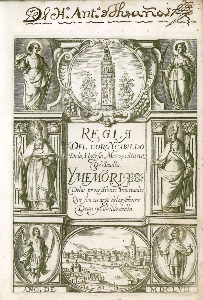 En el frontis arquitectónico, grabado por Román y Codina, aparece en la parte inferior una vista de Sevilla y en la superior la Giralda. Palau recoge una primera edición de 1616, impresa en Sevilla, por Alonso Rodríguez de Gamarra, en 4º con 8 f. y. también recoge una edición de 1760 con el título de "Regla del Coro y Cabildo de la Santa Yglesia Patriarcal de Sevilla" con 2 h.-279 p.