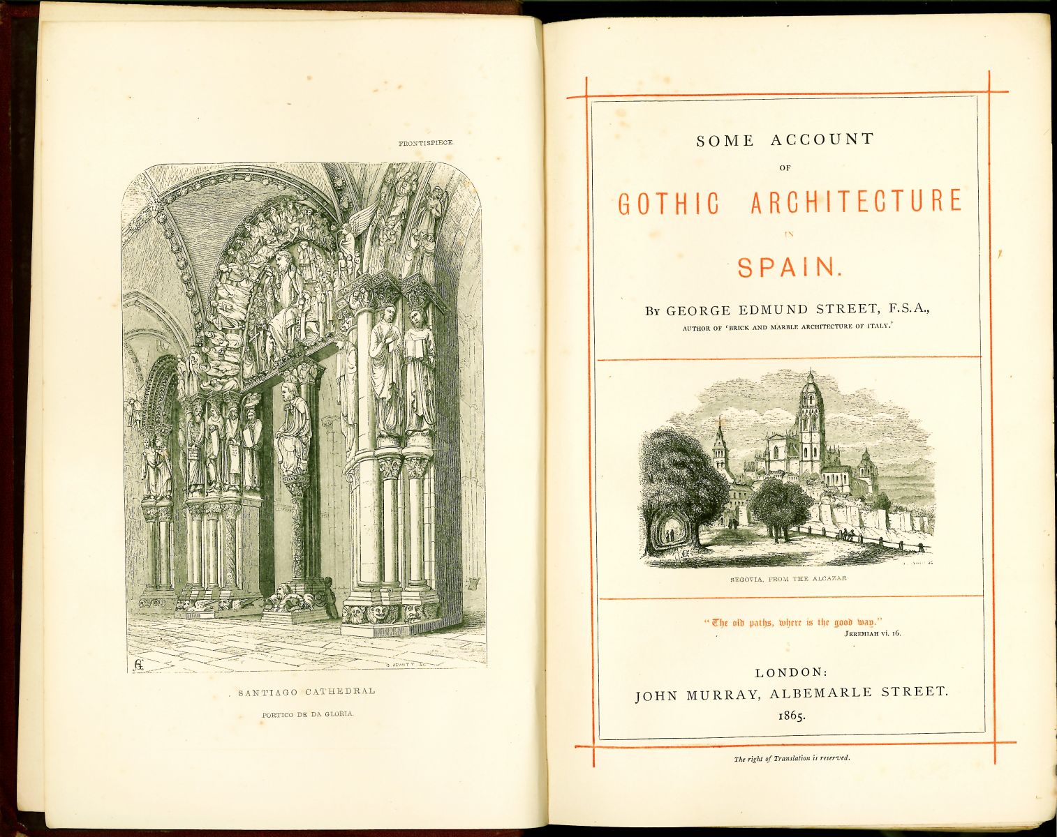 Primera edición. La obra del arquitecto George Street, con telón de fondo de un viaje por España hecho en 1861 - 1863, aprovecha la de Eugenio Llaguno y Amirola y critica la de Villa-Amil por su falta de fidelidad. 'Obra de prestigio por sus atinadas observaciones críticas acerca de los monumentos de estilo gótico de España'. Palau 322.921.