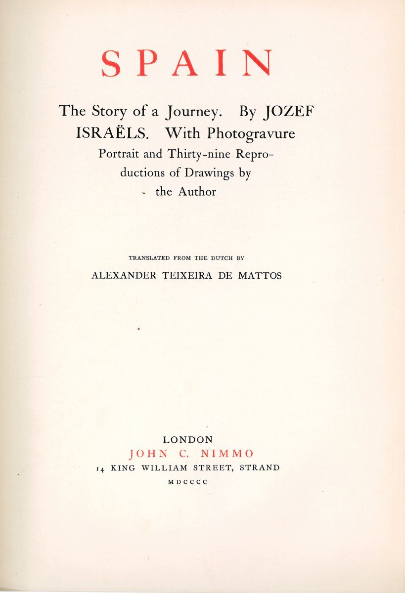En folio menor, tela editorial. XII p.-224 p. Fotograbado con retrato del autor sobre pintura de Jan Veth. 39 reproducciones de dibujos del autor entre el texto. Obra escrita originalmente en alemán. El autor es el pintor neerlandés, judío de origen sefardí. En los últimos años del siglo XIX realizó un viaje por España que luego reflejó en este libro; analizó en él la cultura y el arte españoles manifestando el parecido y las diferencias que percibía con la cultura neerlandesa en los aspectos sociales, económicos, religiosos y artísticos, no sólo en pensamientos y observaciones, sino también con apuntes sencillos y bocetos a lápiz y acuarela, que publicó junto con el texto en Holanda en 1899 y en inglés en 1900. Ex Libris de John George. Bartholomew.