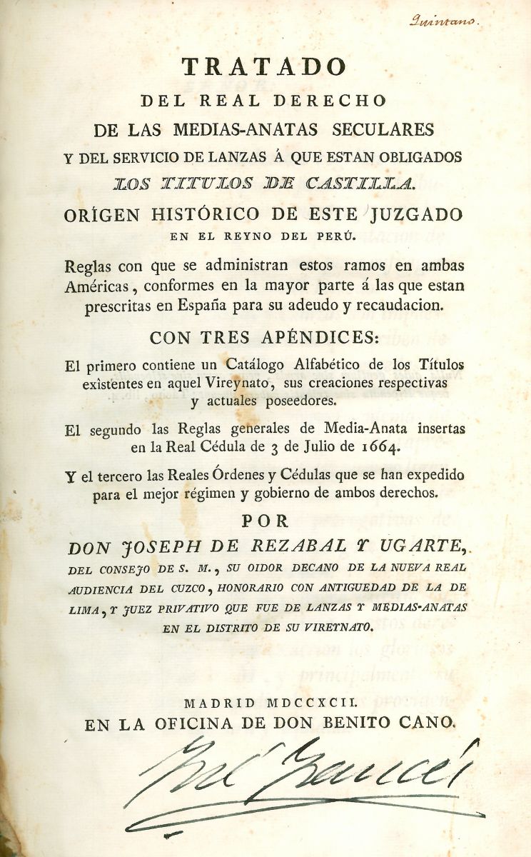 Tratado del Real Decreto de las medias-anatas seculares y del servicio de lanzas à que están obligados los titulos de Castilla. Origen histórico de este juzgado en el Reyno del Perú. Reglas con que se administran estos ramos en Ambas Américas, conformes e